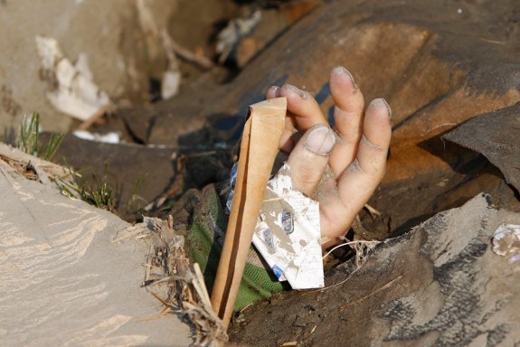 A victim’s hand sticks out among the rubble after a magnitude 8.9 earthquake and tsunami struck Rikuzentakata, northern Japan March 13, 2011. (REUTERS/Toru Hanai)