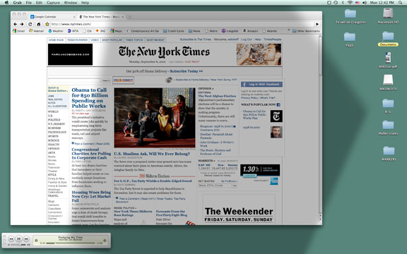 Shadow, Glare explores such experiential disruptions through a subtle visual intervention: Without altering the computer’s normal operations, the program renders a morphing series of translucent forms that seem to float between the screen’s real surface and the immaterial desktop. This simulation can blend unobtrusively with any actual shadows that happen to be cast on the screen; users may continue to work or browse while only peripherally aware that the program is running. But the slowly evolving forms can also occlude the desktop and interrupt the user’s focus.
