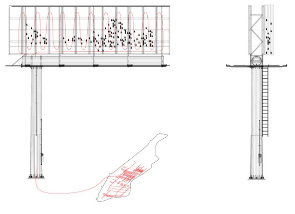 Humans can now decode the strange language of bats into comprehensible words and sentences thanks to the Bat Billboard (by Chris Woebken and Natalie Jeremijenko), an interactive billboard that creates novel social interactions between bats and humans while doubling as their shelter. The billboard contains a monitoring equipment inside which uses voice-recognition software to map and translate the calls of resident bats, matching them to archives of various call patterns and meanings, (currently being compiled by biologists), then displaying the resulting messages on a screen. While bats are known to serve a key role in many ecosystems, in urban habitats, they are often seen as threats or pests. The Bat Billboard seeks to dispel this misinformation by enabling them to communicate with us about their need in the urban environment. The billboard also provides a sturdy infrastructure for the city bats to live and hibernate, an attempt to help them counteract the mysterious White Nosed Syndrome (a disease and environmental health emergency that millions of New York bats have dies from since 2007) and other threats to their population.