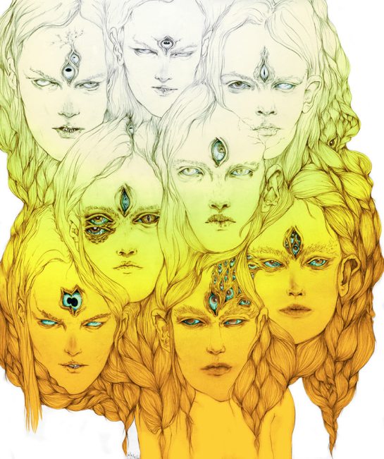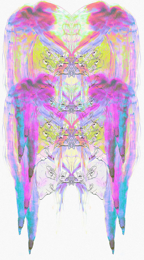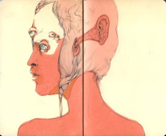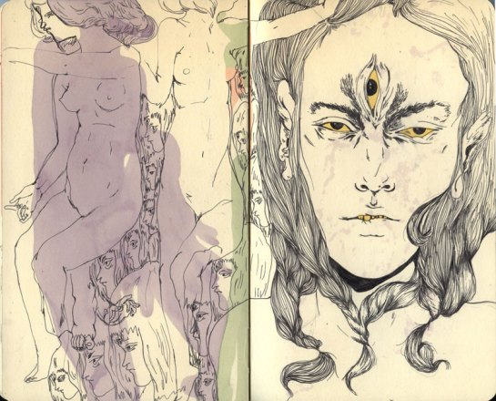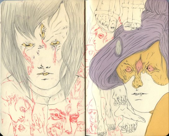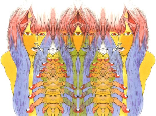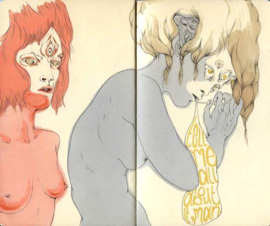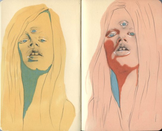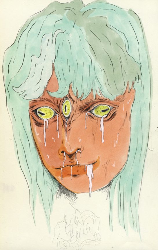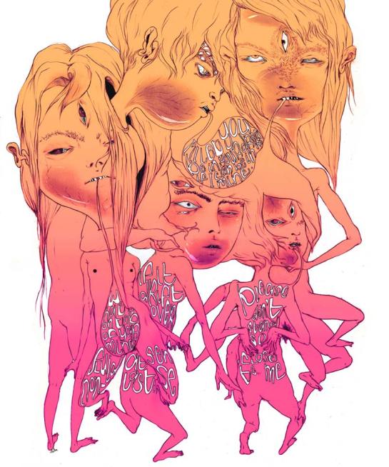 With that being said, I introduce you to Lauren Albert AKA Lala, an illustrator and textile designer living in Brooklyn, New York. As soon as I came across her illustrations I was amazed by the colorful, distorted, twisted, and at times multi-limbed/eyed figures. There is something disturbing about her work in general, it has a very particular style to it, and something too inventive and intriguing to ignore. Her drawings are stretched out and swelled like they’re in a lava lamp, and usually assembled withe text – creating a commune of stylish cohesion. In the constant quest to find ‘right coloring materials’, she uses the flattest most brightest mediums, not limited to pens, markers, gouache, watercolor and color pencils to render her the depths of her alien world. She works both digitally and by hand, but I prefer her drawings, they reveal a raw texture full of scribbles and shaky emotions – she is truly who she proclaims her self to be, a “master of psychedelic figures and worlds.”