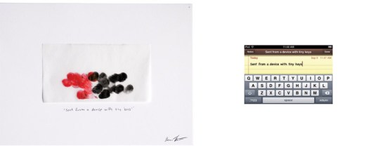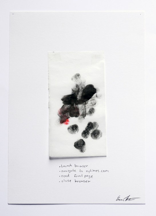 Finger painting has just become a serious art form thanks to American artist and researcher Evan Roth, who has created a series of images that map the movement of routine tasks performed on an ipod touch entitled ‘multi-touch finger paintings’. He has taken the prints we hate, the terrible screen smudges and the interfacing motions we orchestrate, to create simplistic yet intrinsic pieces of art. The activities include checking twitter to reading the front page of the new york times online. To create these amazing paintings, Roth utilizes tracing paper and an ink pad – black for the right hand, red for the left – to delineate the altogether modern practice. By combining notions of new technology with the elementary method of finger painting, the resulting project explores everyday behaviour in a conscious and creative manner.