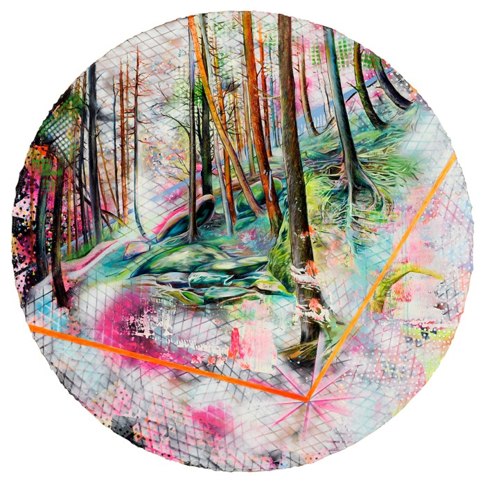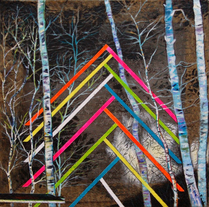 I thoroughly enjoy contrast, for example, the conflict between darkness and brightness. This interest is reflected in nature’s processes of constant change; life becomes death, and death becomes life again. The varnish and the adding of different transparent layers on top of each other is a metaphor for this continuous circulation. Through this technique I can use both the additive and the subtractive blending of colors. Furthermore I am fascinated by the artificial brightness of Neon acrylic paint and the special perception of its transparency. The result is the confrontation of nature with a layer of unnatural and formalistic commentary. I have come to realize that I have an emotional sensitivity to color and that my color choices are strongly influenced by the street art of Berlin; I paint for the love of painting and the joy of creation.