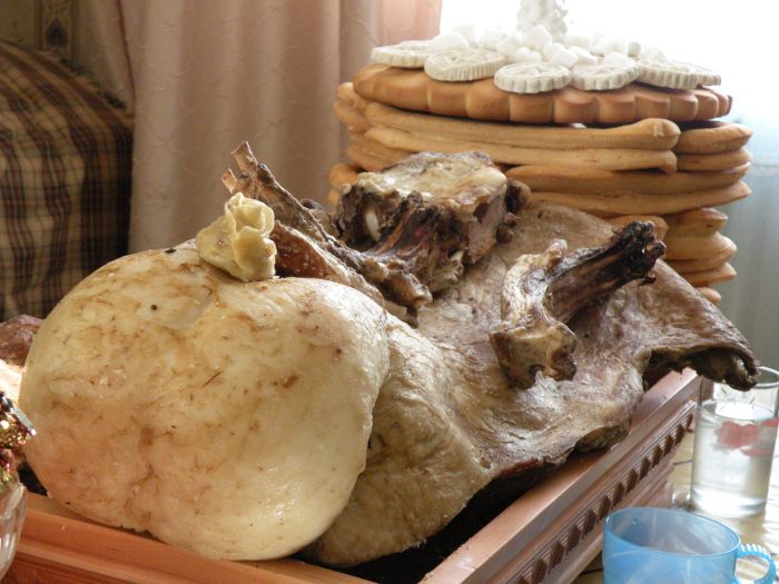 above: Tsagaan Sar table essentials. In front: cooked sheep’s back, tail and ribs. In back: Homemade Biscuits Tower – on top is all kinds of candy, sugar cubes, and dairy products. Biscuit Towers may have either 3, 5, 7, or 9 layers. The odd number layers represent one layer of sadness sandwiched by two layers of happiness. The number of layers is based on a mixture of the homeowner’s age and years of marriage.