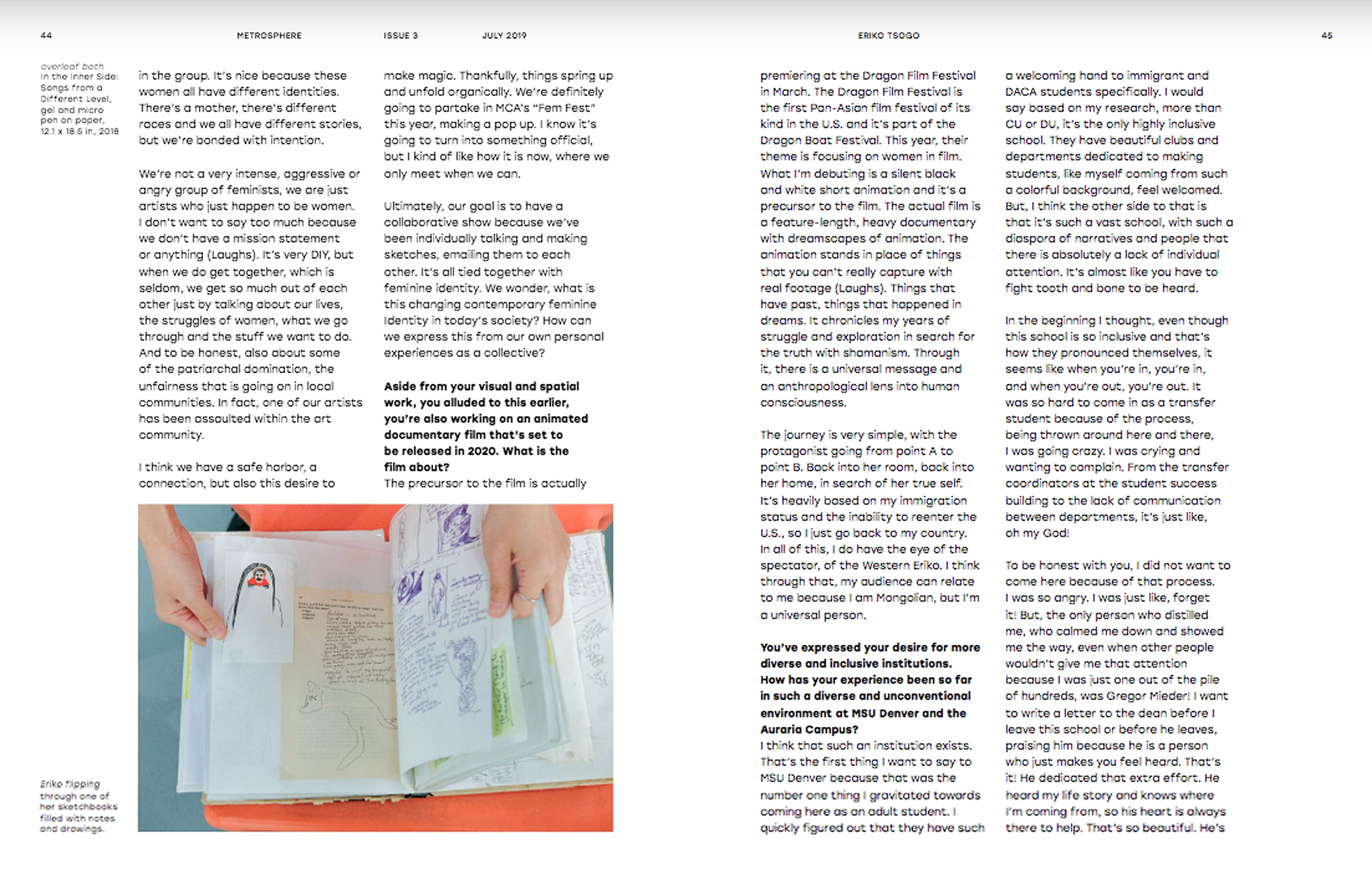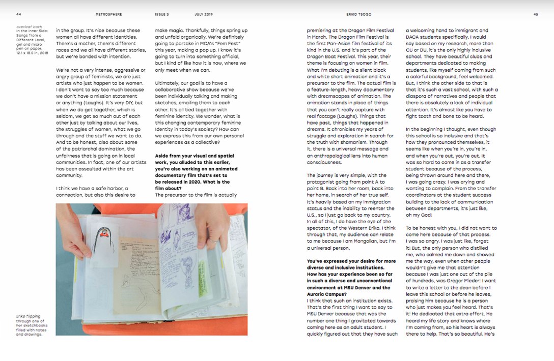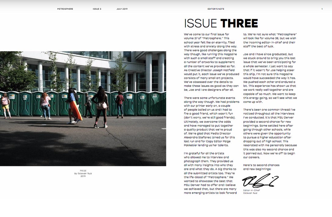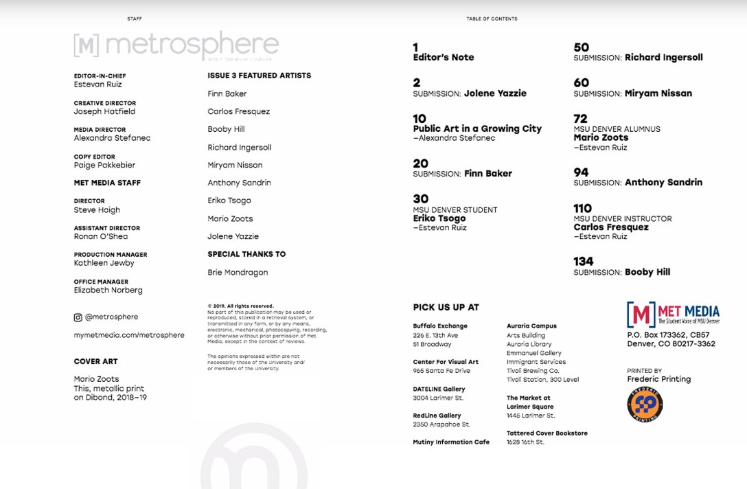 Metrosphere, is a monthly an arts, lit and culture multimedia magazine publication that professionally showcases the creative work of students and alumni of Metropolitan State University of Denver. In print since 1984, Metrosphere offers a creative alternative to commercial news outlets. Metrosphere is supported by Met Media, which exists to provide a comprehensive, multimedia learning experience for MSU Denver students.