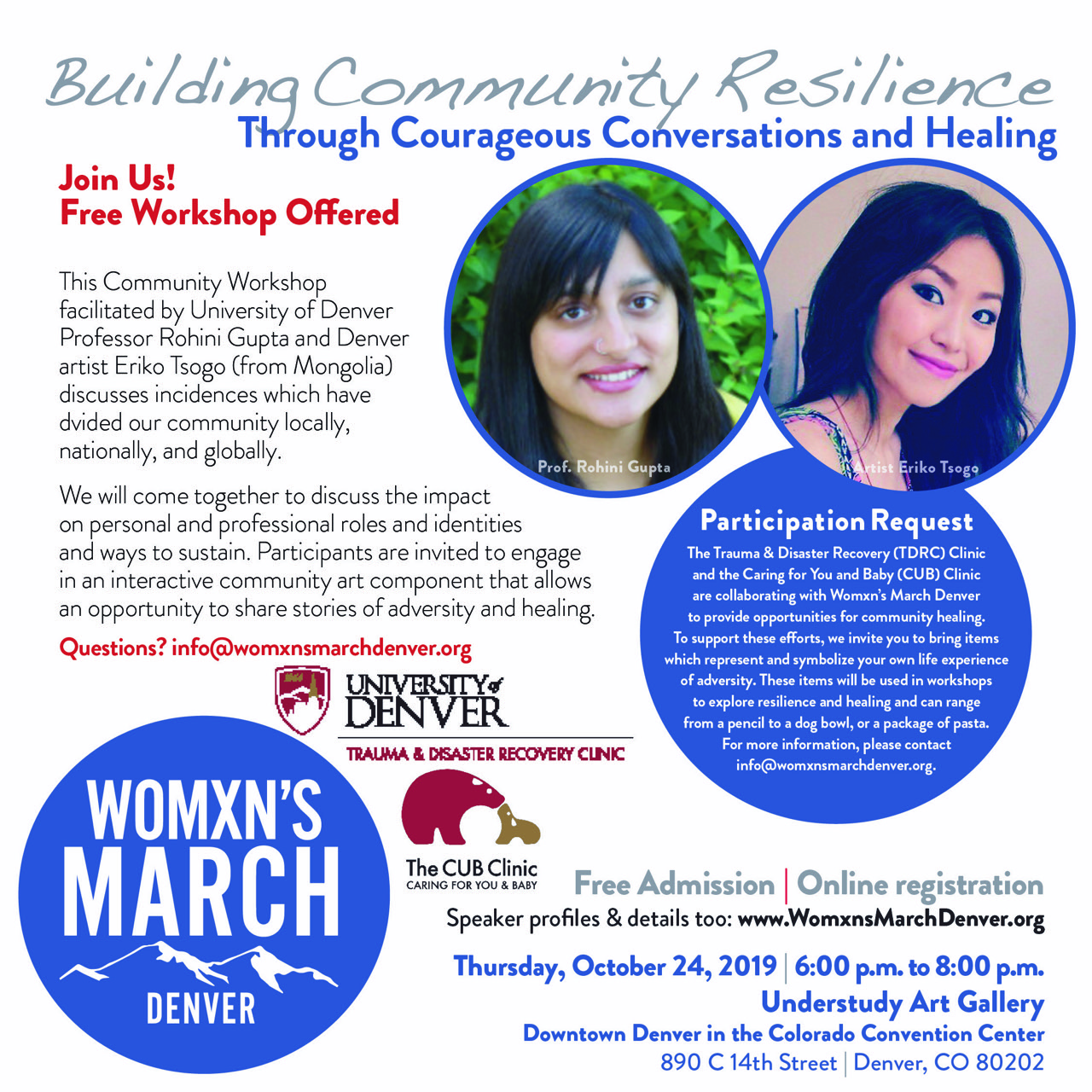 In partnership with the Trauma & Recovery Disaster Clinic, Caring For You and Baby Clinic from the Graduate School of Professional Psychology at University of Denver, we created a community workshop series called “Building Community Resilience Through Courageous Conversations and Healing“.