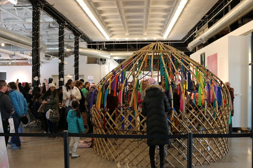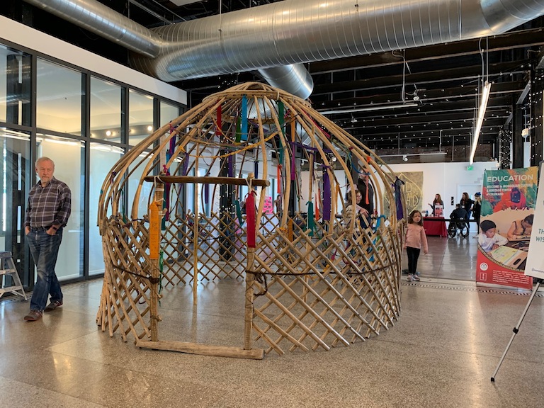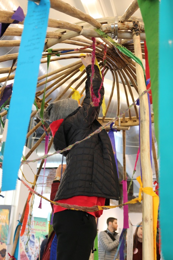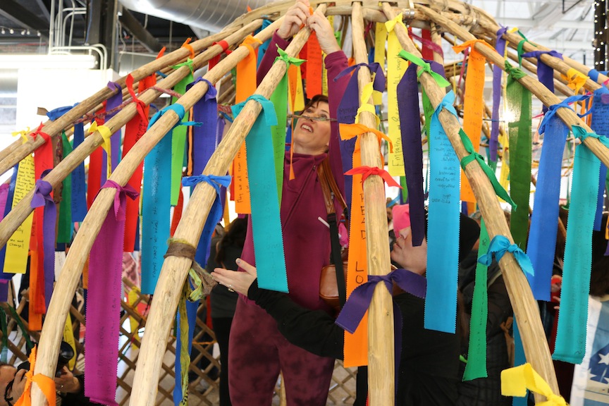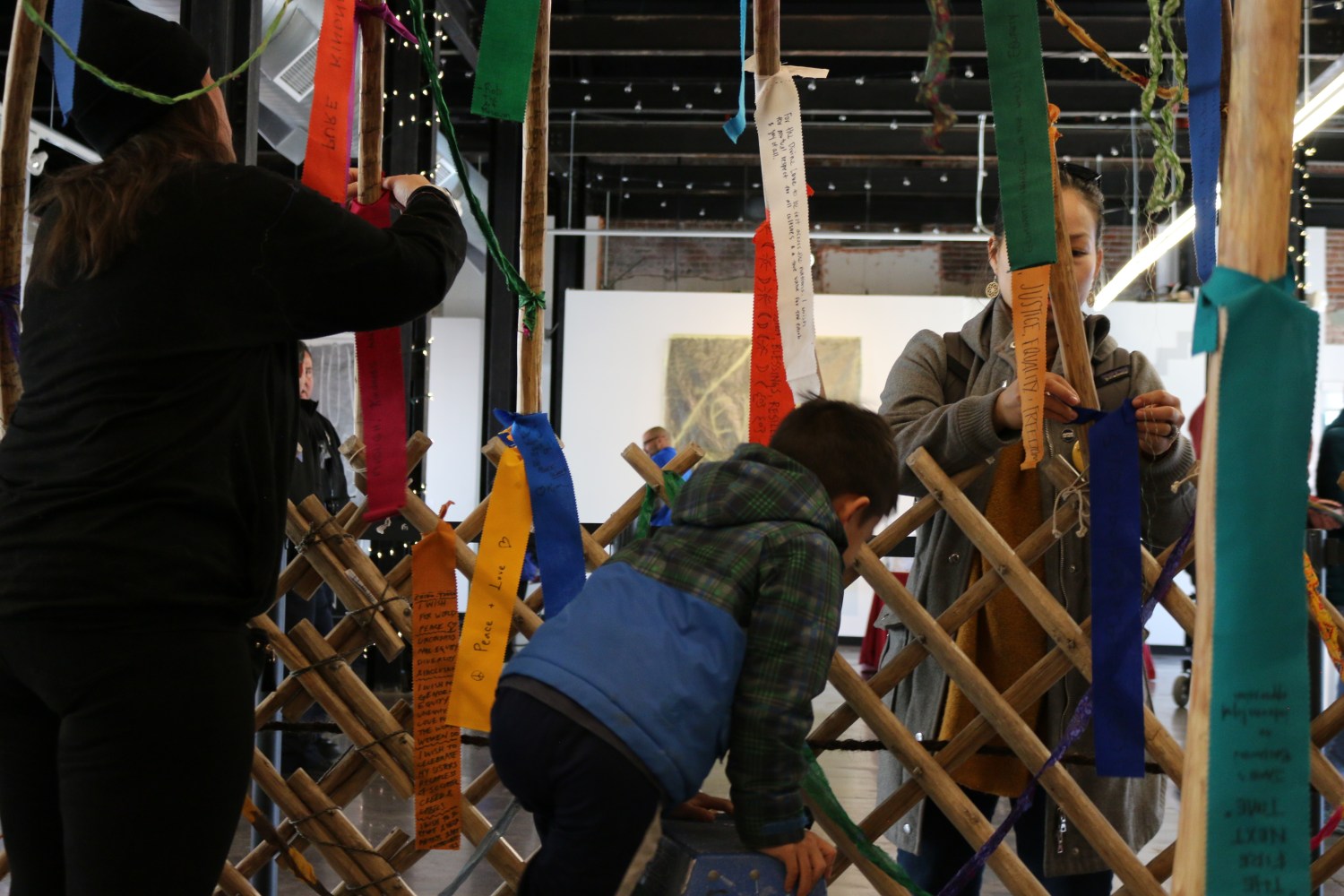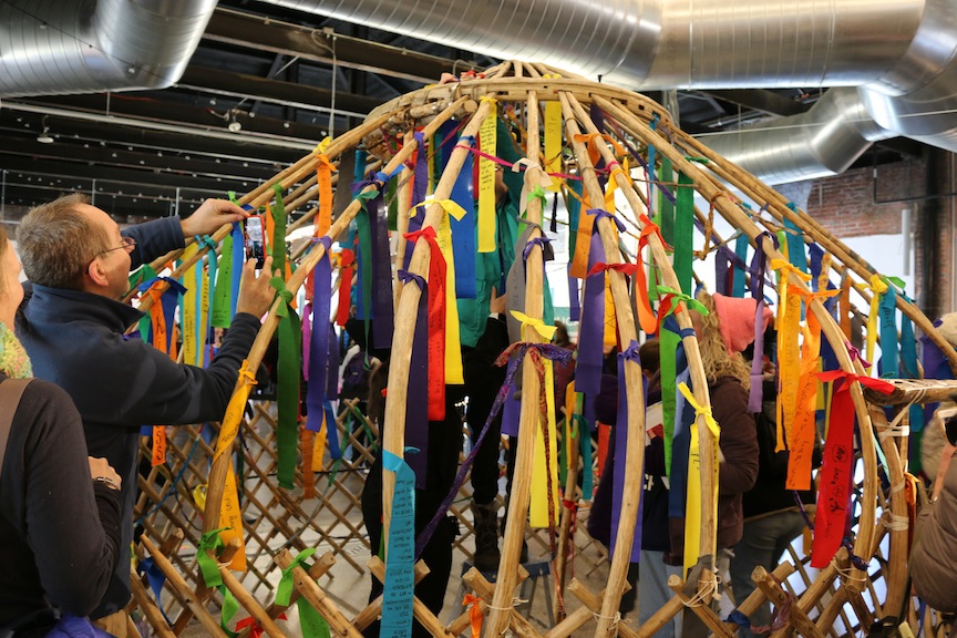 The “Dream Yurt” is a touring project designed to eradicate social barriers through the power of art and community, and in place celebrate kinship across our differences. By engaging/challenging systems of power, the project aims to transform systems of structured oppression and displacement while celebrating diversity, promoting social activism, equal justice, and inspiring social change. Dream Yurt invites participants to make “votive wish ribbons” which gets attached to a 200 year old Mongolian yurt from the Silk Road.