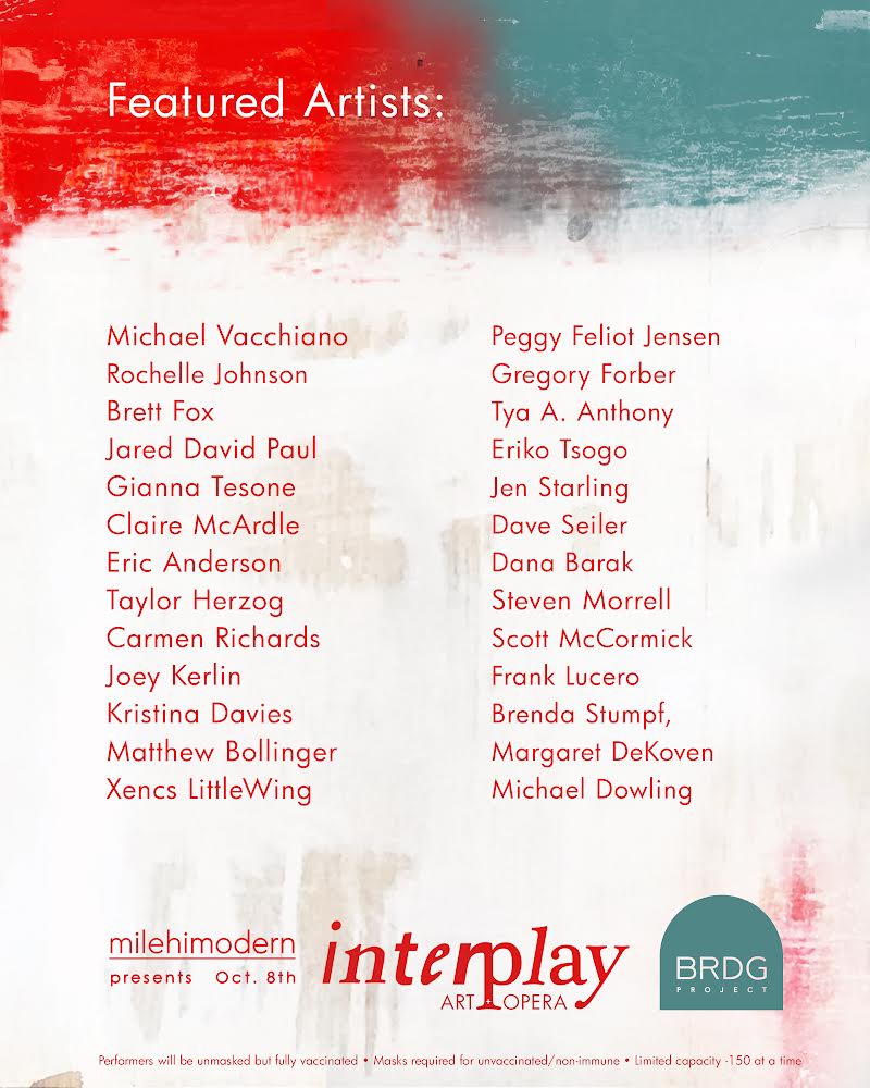 Presented by Mile-Hi Modern and curated by Matarazzo, Dowling and opera singer Leah Podzimek, Interplay – Art + Opera is a collaboration between musicians (Soprano Podzimek, Mezzo-Soprano Kira Dills-DeSurra and pianist Jessica Nilles Kressin) and more than 30 contemporary visual artists commissioned by BRDG project. The show exists as a sort of feedback loop between the mediums, with the idea that each constantly informs and recontextualizes the other.