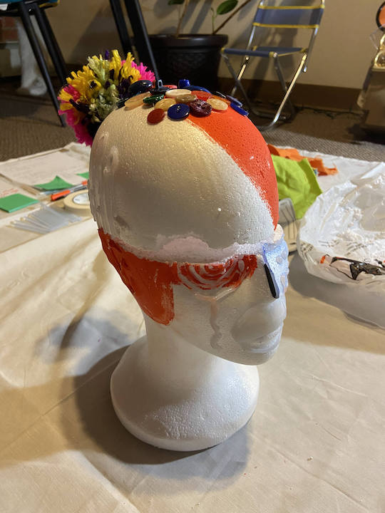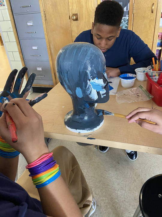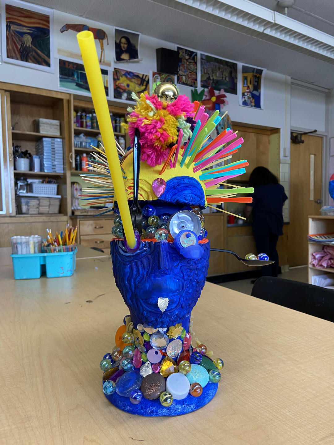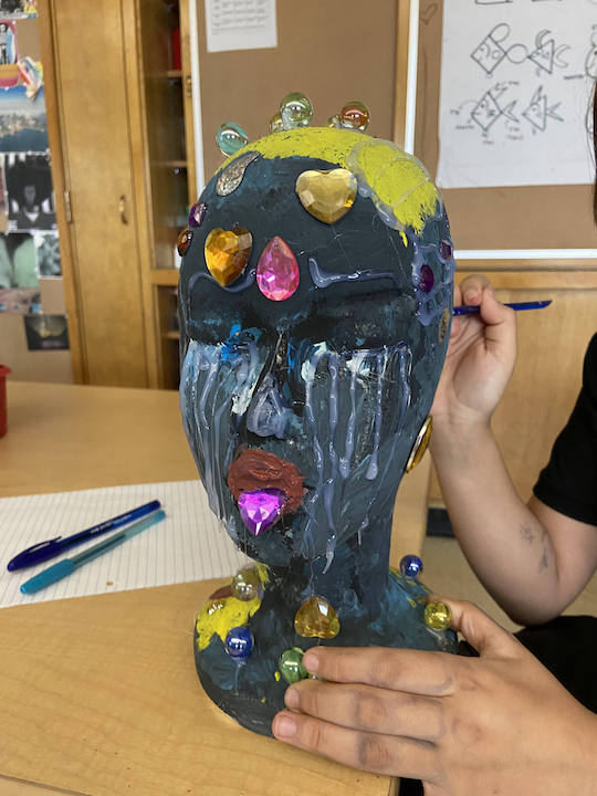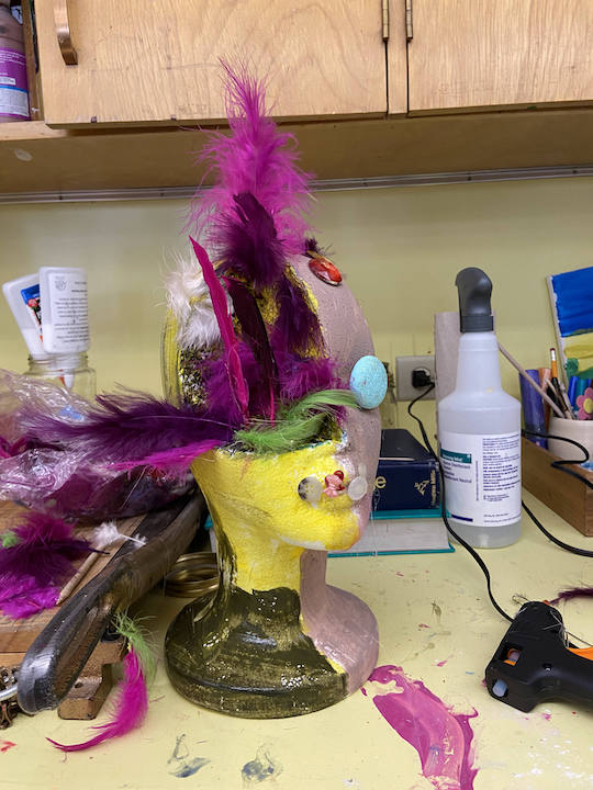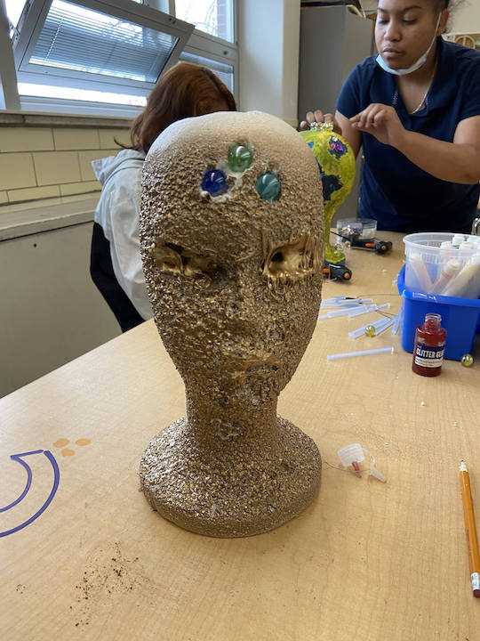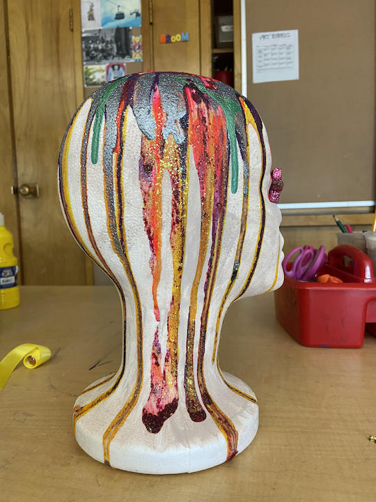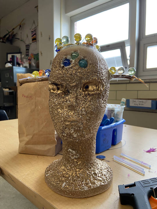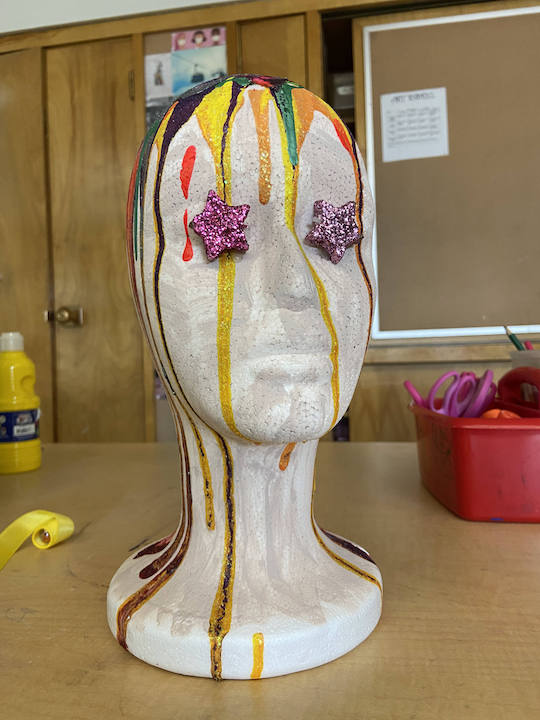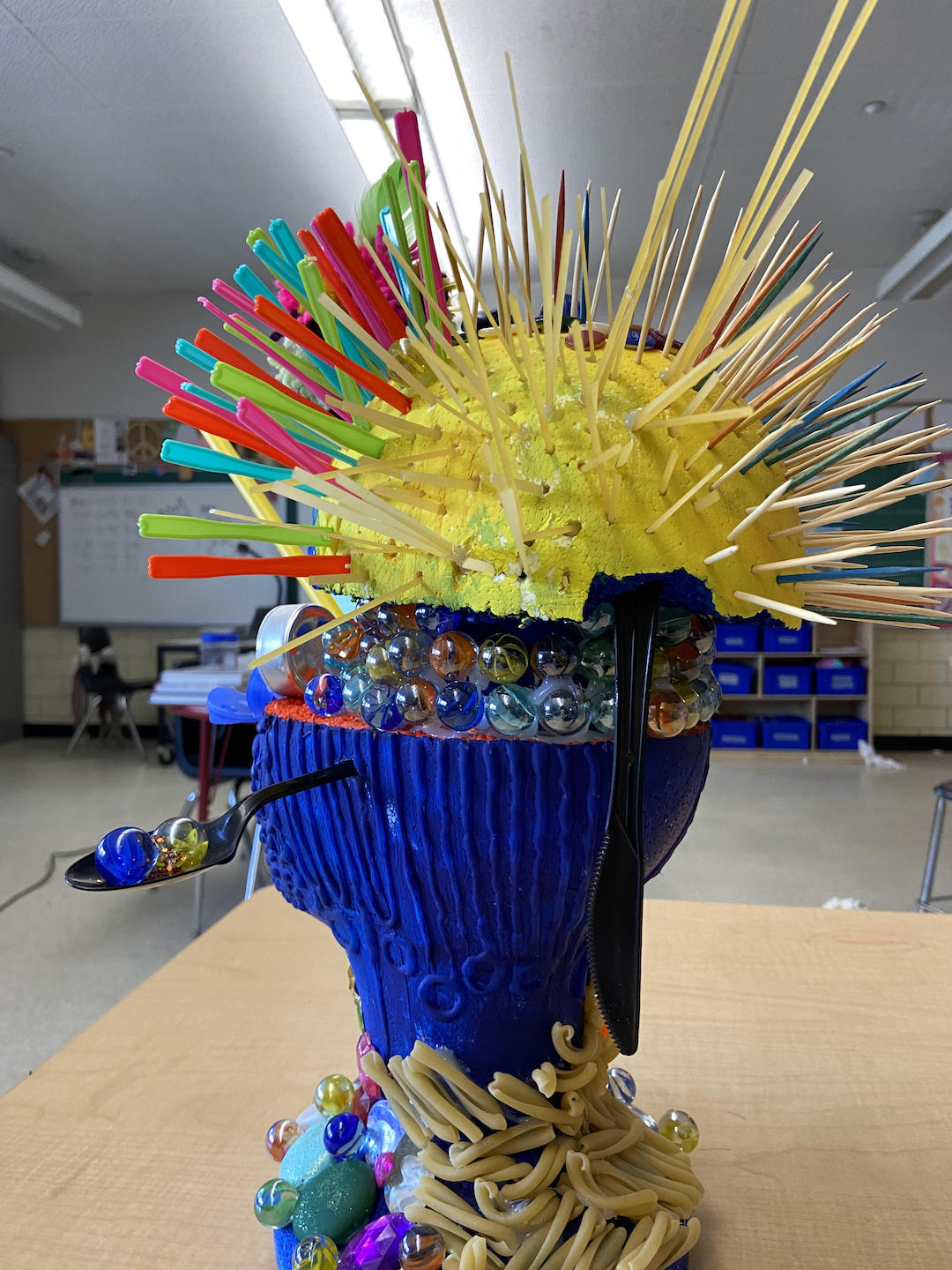 I am working with students to design symbolic self portrait sculptures using a malleable styrofoam base as a simulation of their face to express inner and outer most selves using a variety of mixed/natural materials to reference symbolic meaning and social messaging. The Styrofoam base provide a fun container where student can express a variety of voices, colors, opinions and individual social issues like race, identity, sexuality, family, culture, etc. Each sculpture represents a statement on how the pandemic has challenged and changed our youth generation.