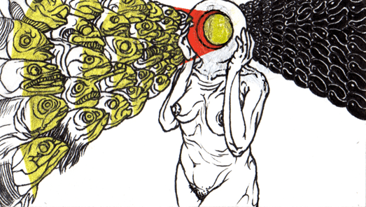 Mediums used: graphic pen, gel pen, masking tape, collage, blood, mechanical pencil, alteration of original surface by ways of cutting, obliteration, subtraction and addition.