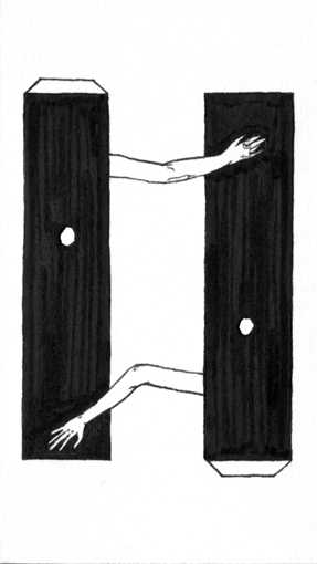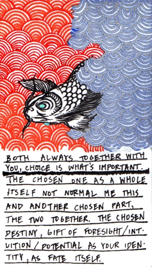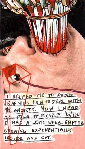 Mediums used: graphic pen, gel pen, masking tape, collage, blood, mechanical pencil, alteration of original surface by ways of cutting, obliteration, subtraction and addition.