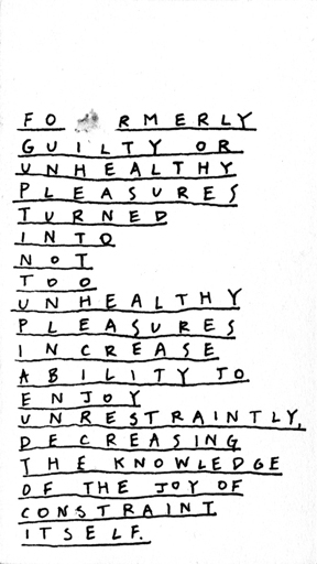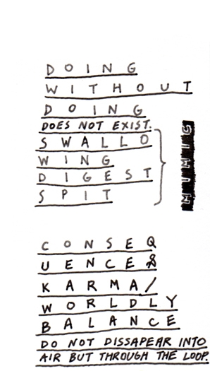 Forming parenthesis to infinitesimal brevities, the 1001 Cards – A Drawing Project is an ephemeral symptom archive of a life accumulated by grids. These are my personal visual philosophies based on a repository of inner private observations created on collected business cards from all my travels and encounters over the years. Text regurgitated as morphological excess to inspire and or alleviate thinking prolongs; thereby welcoming the absurdities that lie therein and other lighthearted attempts to make sense of the world.