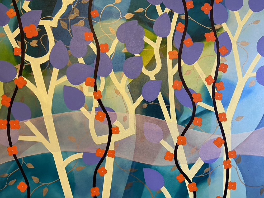 Chambers’ works in “Passages” challenge conventional storytelling by placing the viewer at the heart of an abstract narrative. By incorporating motifs of landscapes and emblematic botanical elements—simplified depictions of flowers, trees, and leaves—the artist creates a stage for universal experiences. Inspired by the phenomenon of synesthesia, Chambers describes his work as a “smelling of colors, hearing of shapes” experience. Drawing from a rich tapestry of art history and global traditions, Chambers seamlessly weaves elements from medieval illuminated manuscripts, Impressionism, Post-Impressionism, and African, Asian, and South American folk arts into his distinctive works.